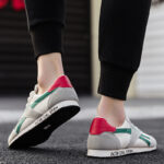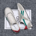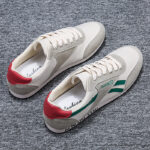 These retro-style casual sneakers feature a gray base accented with green stripes and a bold red heel, delivering a unique vintage-inspired look. Made with high-quality canvas and suede materials, the upper is soft, breathable, and durable, ensuring long-lasting comfort. The lightweight design, paired with a wear-resistant and anti-slip rubber sole, provides stability and grip, making them ideal for commuting, casual outings, or light sports.
